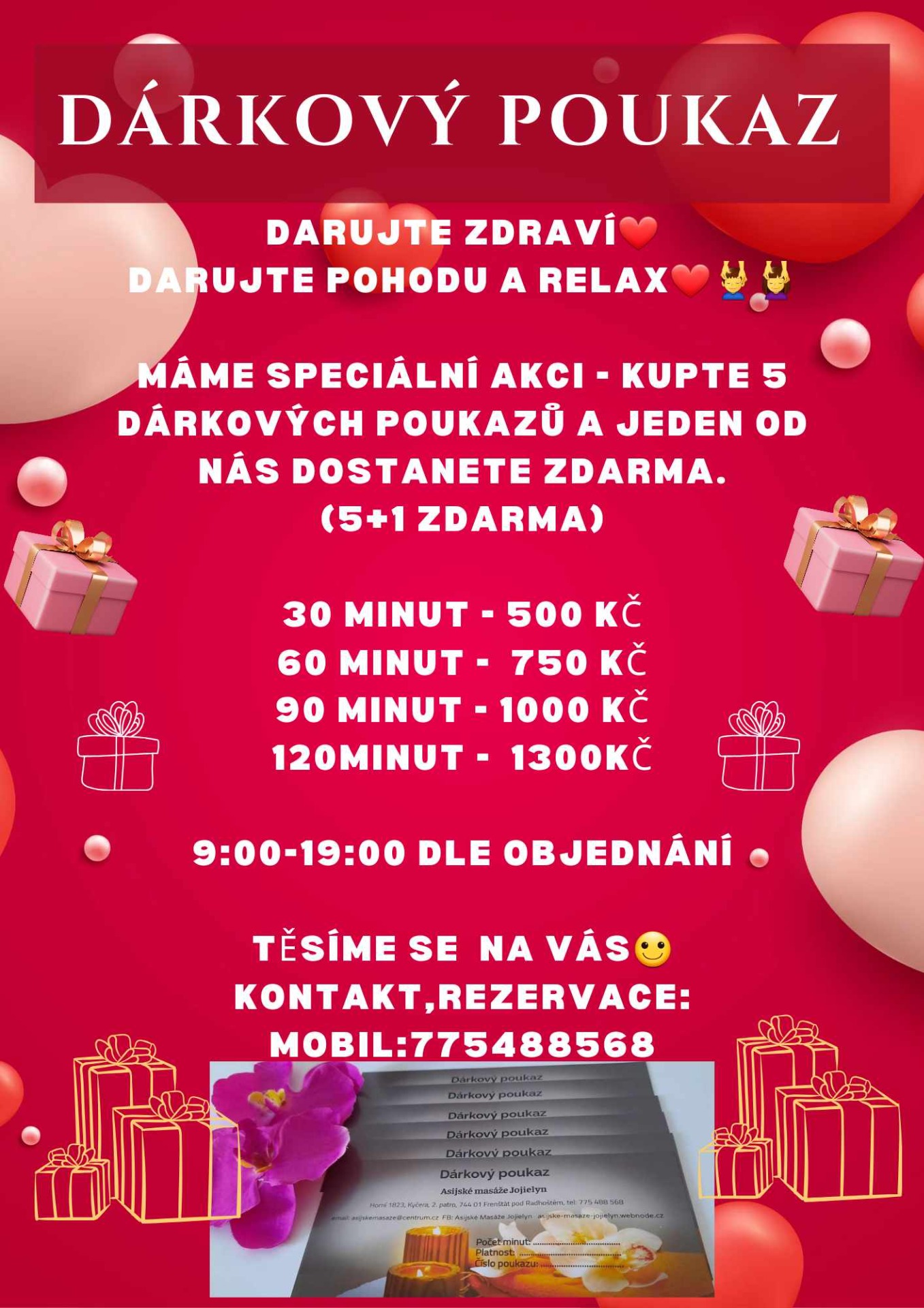 Máme speciální akci-kupte 5 dárkových poukazů a jeden od nás dostanete zdarma.(5+1) poukazy na 30, 60 , 90 a 120 minut na libovolnou masáž: